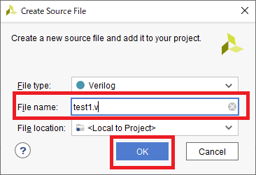 図41の画面で“Create File”をクリックします.図42の画面ではFile typeの欄で“Verilog”を選び,File nameの欄にファイル名を入力します.今回は“test1.v”としました.Verilogファイルなので,拡張子は“.v”です.
