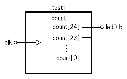 ここで定義している論理回路は図47のように非常に単純なものです.25ビット幅のレジスタ“count”を用意して,“clk”信号の立ち上がりエッジで値をインクリメントしています.出力の“led0_b”は“count”レジスタの25ビット目をそのまま接続しています.これで,Zynqの外部から入力される125 MHzのクロックを分周した信号がLEDに印加されるようになります.