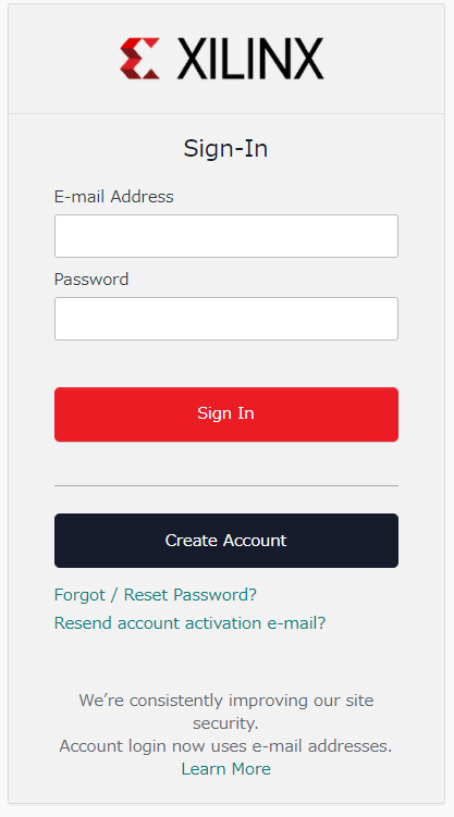 Vivadoのインストーラをダウンロードするために,Xilinx社のダウンロード・ページにアクセスします.アカウントは無料で作れるので,この機会に取得しておくことをおすすめします(図4).アカウントを取得したら,ログインします(図5).