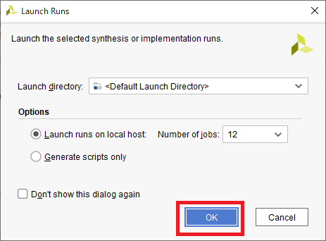 Verilogによる回路記述ができたら,「論理合成」(synthesis)を実行します.図48に示すとおり,画面左側の“Flow Navigator”の中の“Run Synthesis”をクリックします.図49の画面では“Launch runs on local host”を選択し,論理合成に使用するプロセッサのコア数(自分の環境の最大値がおすすめ)を設定して[OK]をクリックします.
