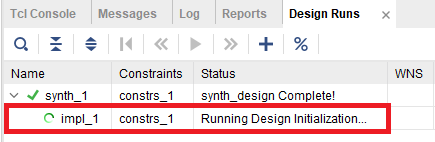 図50のように画面下部の“Design Runs”タブに論理合成中の様子が表示されるので,完了するまで待ちます.論理合成が完了すると図51のように次の動作を質問されるので,「配置・配線」(implementation)を実行します.