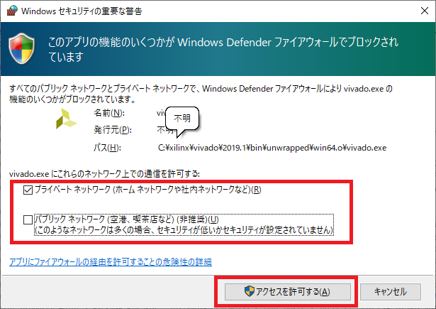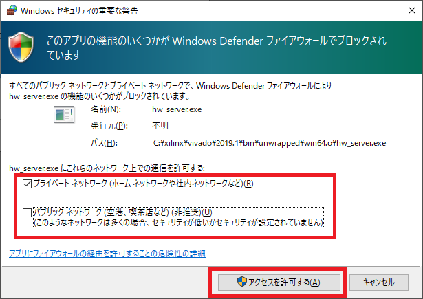 Eclypse Z7ボード側の準備ができたら,図56のようにVivadoの画面左側の“Flow Navigator”の中の“Open Hardware Manager”をクリックします.初めてこの操作を実行したときは図57の画面が出るので,適宜チェックをつけて[アクセスを許可する]をクリックします.