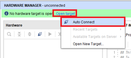 画面の上部に“No hardware target is open”と表示されるので“Open target”をクリックし,“Auto Connect”をクリックします(図58).ここでも初回は図59のようにアクセス許可を求める画面が出るので,適宜チェックを入れて[アクセスを許可する]をクリックします.
