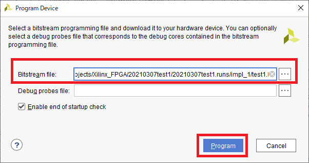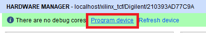 問題なくEclypse Z7ボードとの接続が確立されると図60のように“Program device”と表示されるので,これをクリックします.もし表示されない場合は,ボードの電源やUSBケーブルの接続,“JP5”のジャンパが“JTAG”側になっていることなどを確認してください.図61の画面では先ほど作成したビットストリームが選択されていることを確認し,[Program]をクリックします.