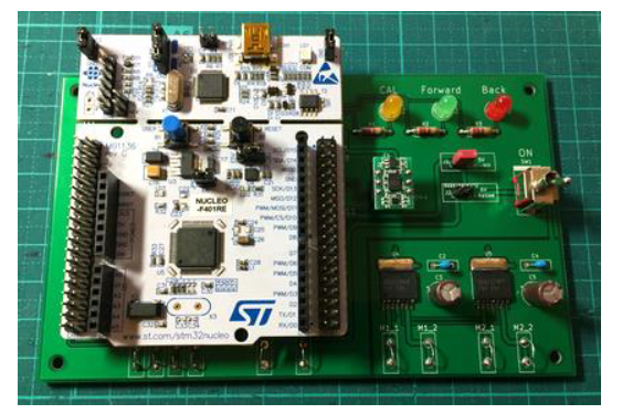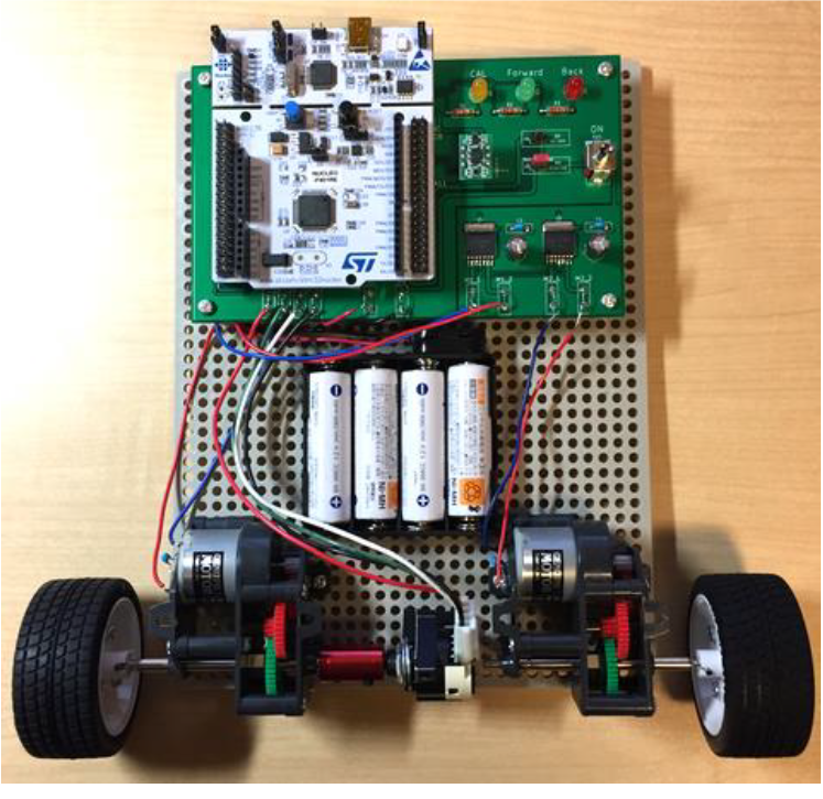 | 写真4: すぐに開発を始められるNUCLEO-F401REボードを採用 | 表1: 姿勢の計測とカルマン・フィルタによる真値推定,モータ制御に使用したSTM32F401マイコンの仕様 |