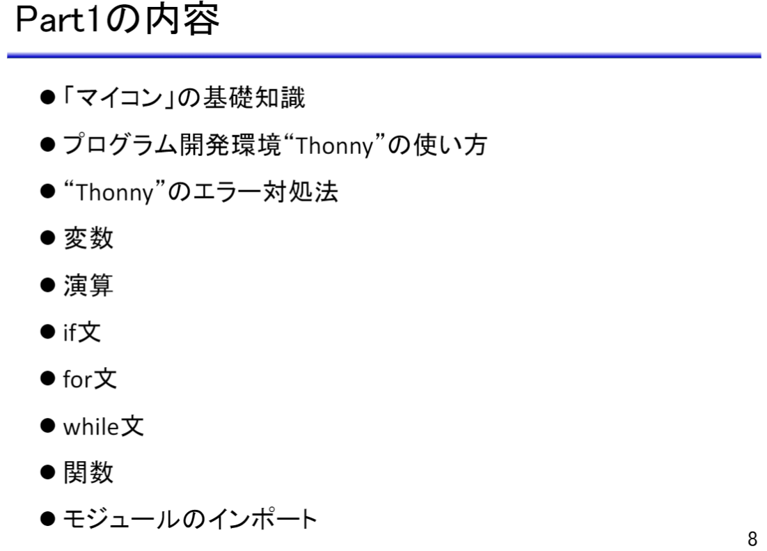 コンピュータやプログラムのしくみを理解し,実習キットを動かしながら,サーボモータやLEDを制御したり,アナログ信号を読み取るPythonプログラミング技術を1日でマスタします.コンピュータやプログラム開発のしくみを解説したのち,サーボモータやLEDを制御したり,アナログ信号を読み取るPythonプログラミングのお手本を示します.