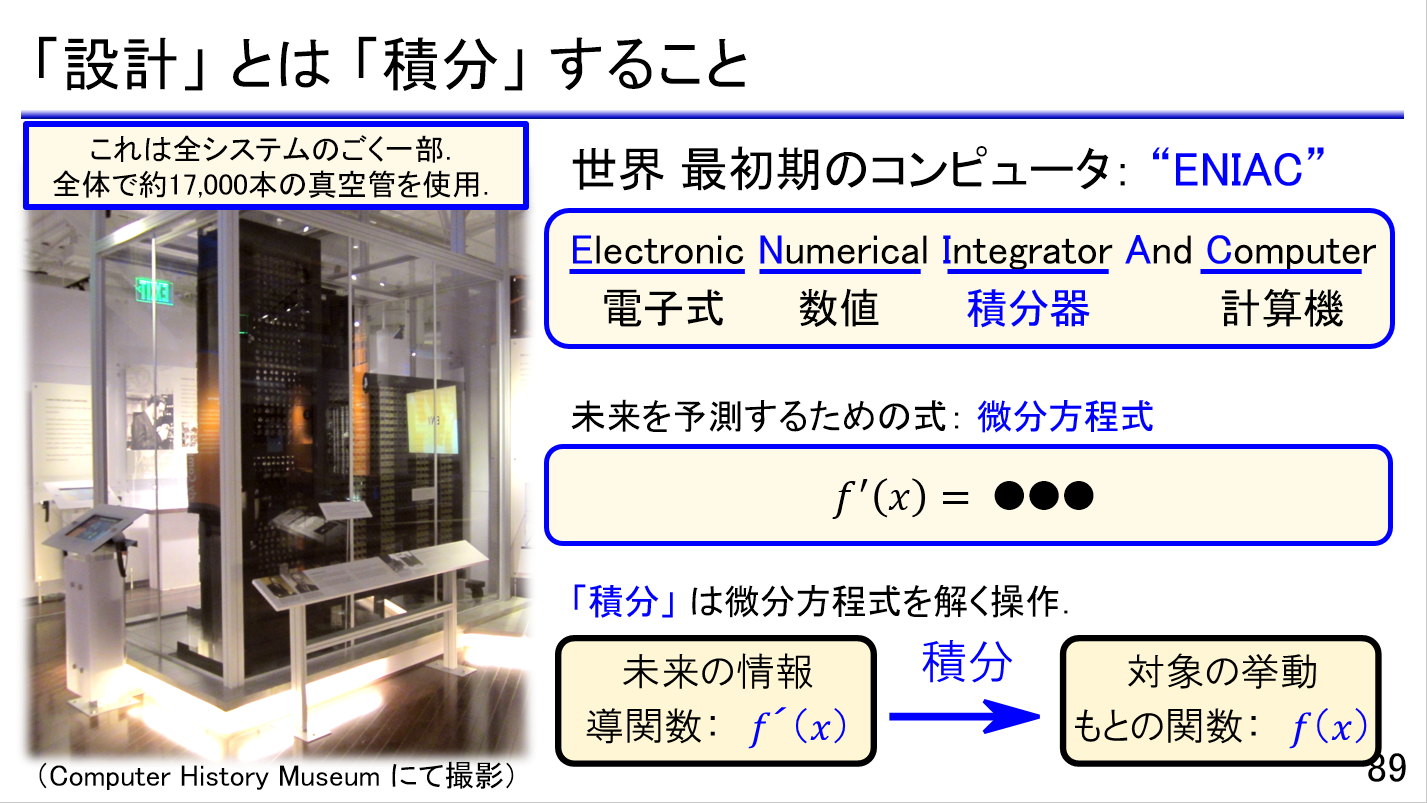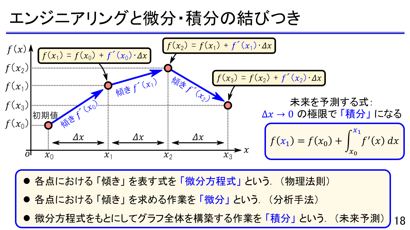 今回のテーマは「微分・積分」です.エンジニアリングにおける「設計」の本質は「微分方程式を解くこと」であり,微分・積分は興味のある対象の動きを表現したり,未来の挙動を予測したりするために必須の道具です.本セミナでは高校レベルの初等関数から始めて,テイラー展開やオイラーの公式といった実践的な内容まで一気通貫で解説します