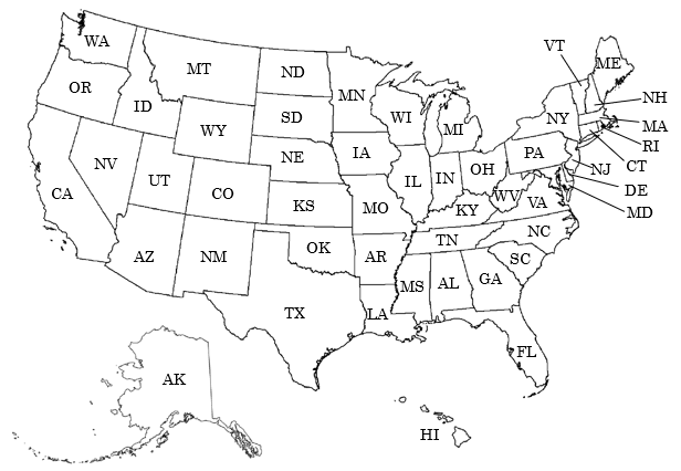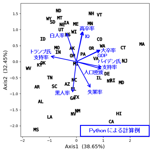 | 図2 アメリカの州名の略称 | 図3 Pythonによる主成分分析の結果…「NH(New Hampshire),VT(Vermont),MN(Minnesota)は平均IQと高卒率が高い」などの傾向がわかる | 図4 Rによる主成分分析の結果 |