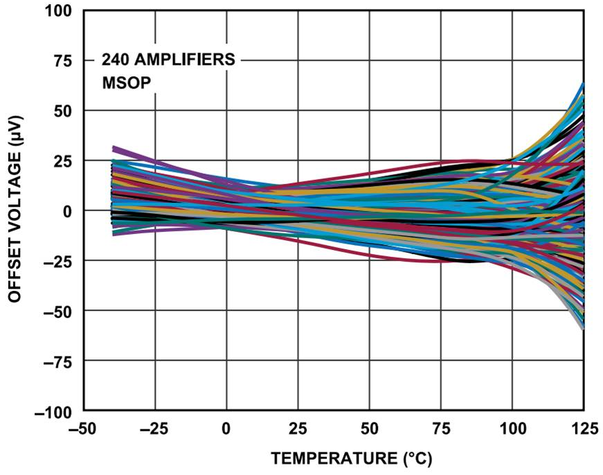 これに対して,入力オフセット電圧の温度ドリフトは,$\pm$ 0.5$\rm{\mu}$V/℃(MSOPパッケージの場合)と規定されています.100℃の温度変化があれば,これで50$\mu$Vのドリフトが生じますから,温度変化によってもかなり誤差が増加することがわかります.なお数値でのスペックでは1℃あたりのドリフトとして記載されていますが,実際は図10のように変化は温度変化に対して直線ではなく,場合によるとS字カーブ的にうねっているものもあります.