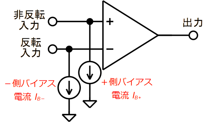 \begin{align*} I_B = \dfrac{I_{B+} + I_{B-}} {2} \end{align*}と定義され,入力オフセット電流$I_{OS}$は,