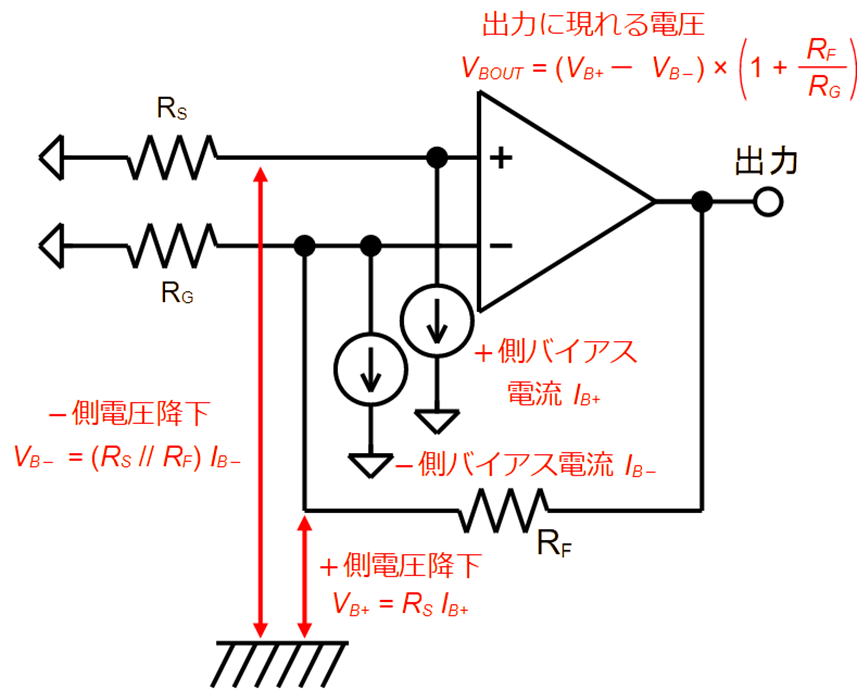 反転入力・非反転入力に流れる入力バイアス電流には差異があります.これを入力オフセット電流と呼びます.データシートには入力バイアス電流は端子ごとの入力バイアス電流の平均値として,