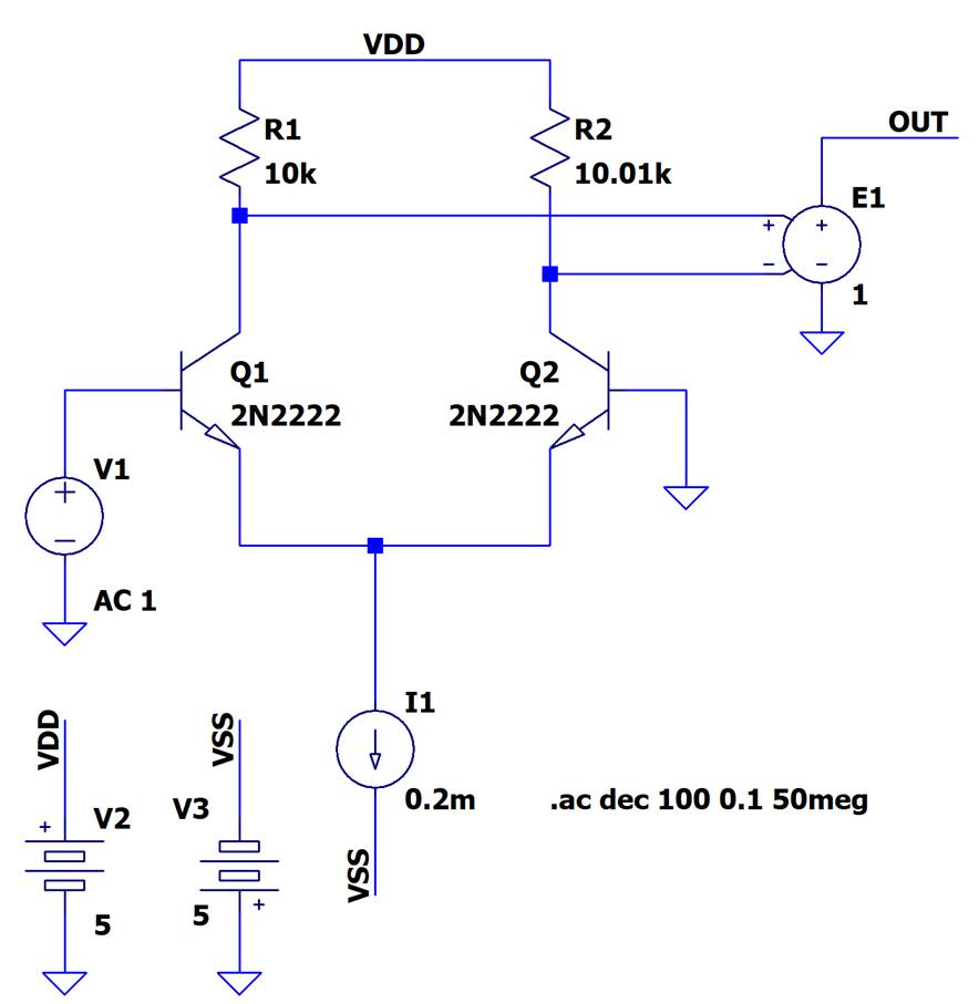 入力の差動回路を単純化したこの回路で,2つの抵抗が0.1$\%$ずれているだけで,出力には986$\mu$Vが現れます(AC解析後にノードにマウス・カーソルを近づけると,事前処理のDC動作点解析結果の数値が表示).