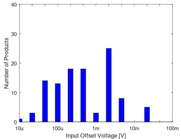\begin{align*} V_{Err} = \left ( 1 + \dfrac{R_F}{R_G} \right) V_{OS} \end{align*}図5,図6,図7はアナログ・デバイセズの製品セレクション・テーブルから抜粋した,OPアンプ製品における,入力構造ごとの入力オフセット電圧(max値)の分布です.横軸は対数で示されており,左にいくにしたがい相当な高精度(低いオフセット電圧)になっています.