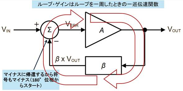 OPアンプのオープン・ループ・ゲインを前方への増幅率$A$とし,帰還率$\beta$を,