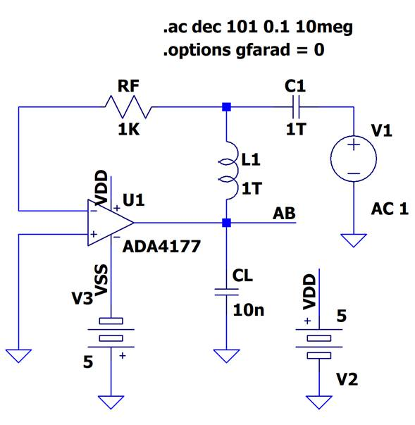 そこでシミュレーションでは見かけ上ループを閉じます.図19にこの回路を示します(ループを閉じるため,高いインダクタンス$L_1$を挿入している).図6に示したADA4177-2で10nF(0.01$\mu$F)を駆動する例です.実測の方法については後述します.