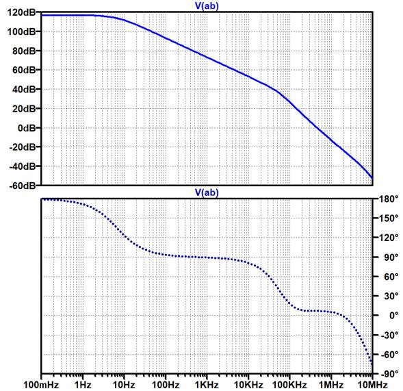 ここに$R_{IN}$が159k$\Omega$であれば,$-$3dB周波数が1Hzの$RC$ローパス・フィルタがOPアンプ内部に構成されることになります.これは図3において直流ゲインが120dB,中央が1Hzになるものに相当し,またこれが第1回で示したOPアンプのオープン・ループ・ゲインの周波数特性を決めるものになります.OPアンプの安定性という観点では「OPアンプは周波数が上昇すると,位相が$-$90°になる」ということがポイントです.