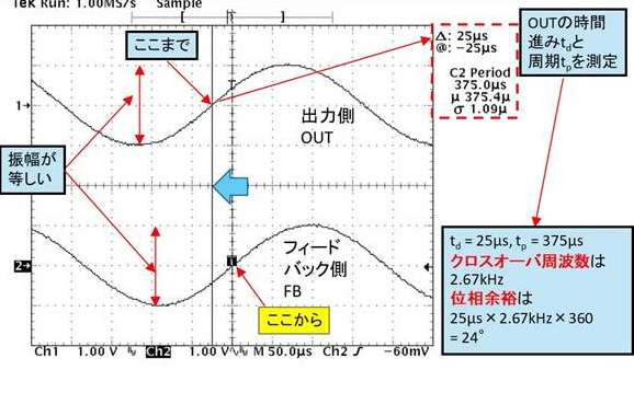 測定はトランス両端のOUTとFBの電圧を観測しながら,それぞれの振幅が同じになる周波数に発振器を設定して,図24のように算出します.