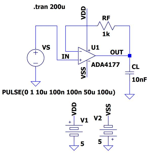 図6のように,OPアンプ出力に容量$C_L=$10nF(0.01$\mu$F)が接続されたことを考えてみます.ここで使用しているOPアンプはADA4177-2というものです.