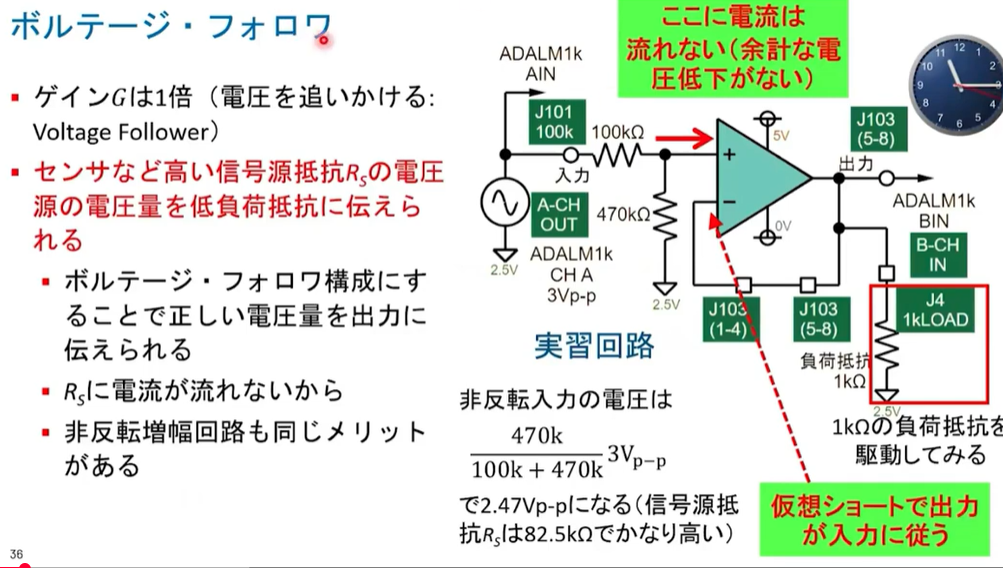 | 図1 ゲイン1倍のアンプ「ボルテージ・フォロワ」は,高い信号源抵抗をもつセンサなどの電圧信号を低インピーダンスの負荷に正確に伝えることができる.画像クリックで動画を見る.または記事を読む.詳細は[VOD/Full KIT/data]実験キットとパソコンで学ぶ Analog Devicesアナログ電子回路教室 |