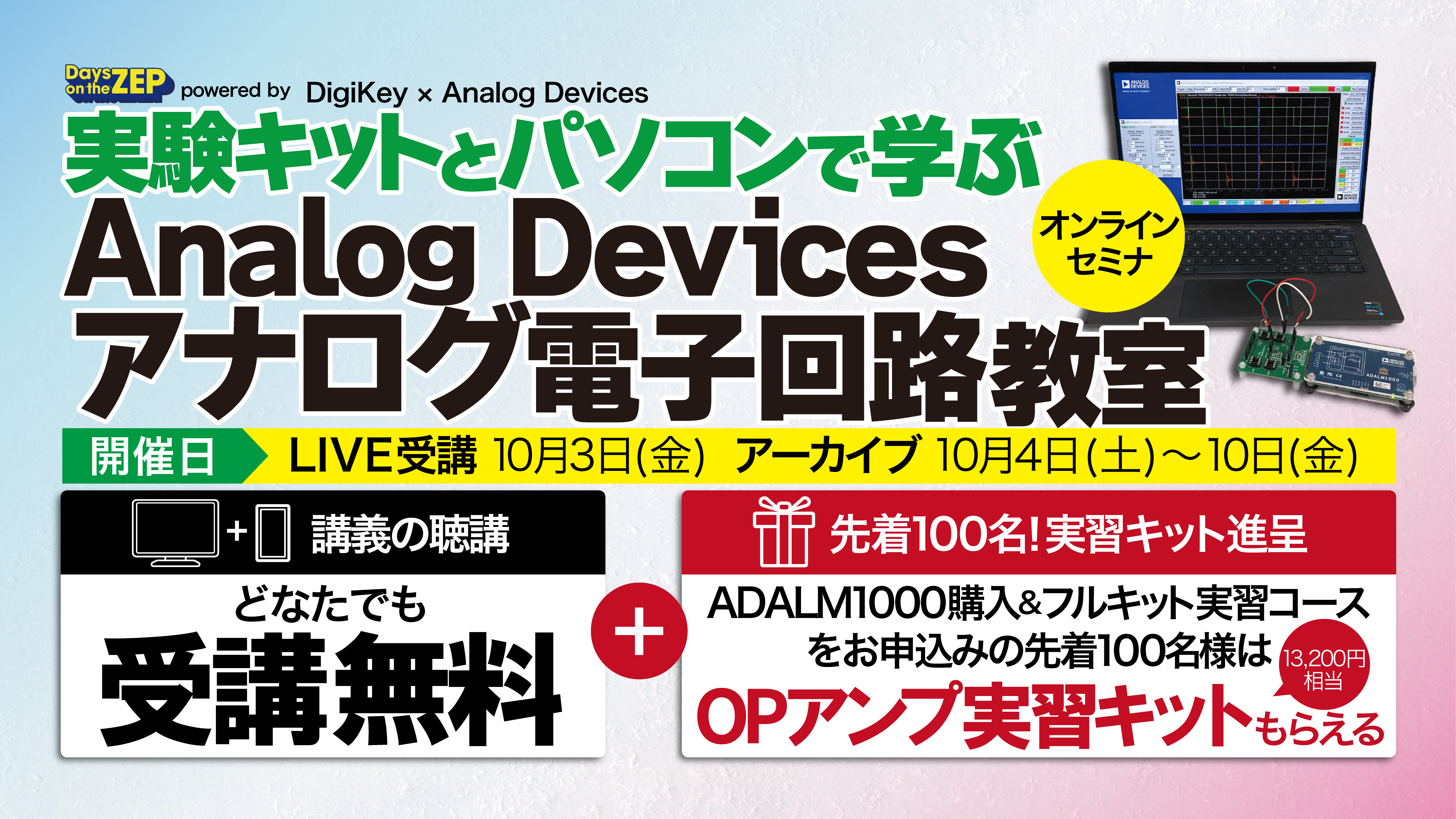 アナログ・デバイセズとDigiKeyは,上記ハンズオン・セミナに加え,さらに,次の2つのコンテンツを用意しました.理論だけでなく手を動かすことで,システムの性能や信頼性の鍵をにぎる「アナログ回路」の基本が確実に身に付きます.
