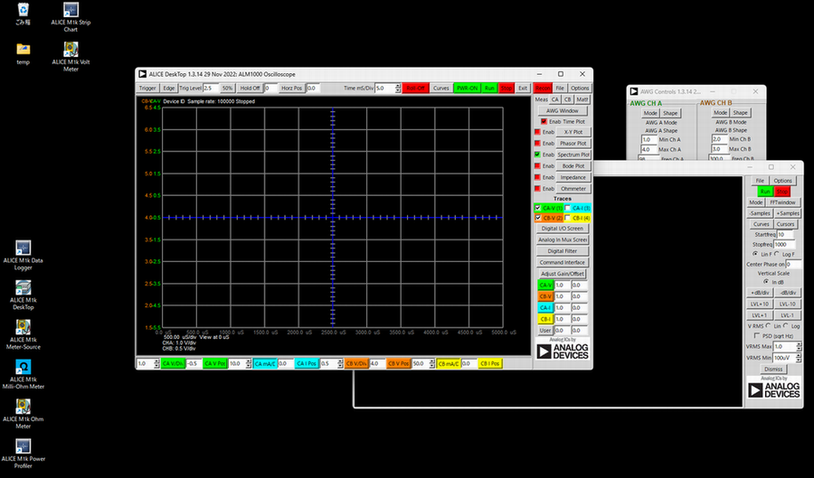 - パソコンのデスクトップ画面にある測定アプリ・アイコンのうち“ALICE M1k DeskTop”をダブルクリックして起動します.“ALICE M1k DeskTop”は,ADALM1000を接続しなくても起動します.