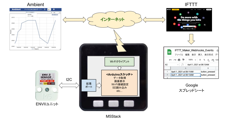人気のLCD付きWi-Fiマイコン・モジュール「M5Stack Basic」と開発環境「ArduinoIDE」の基本操作を中心に,環境センサ・ユニットを動かしながら,スタンドアロンでデータを測定したり,インターネットでの連携サービスである「IFTTT」を使ってデータを収集したり,データ可視化サービスである「Ambient」を使ってグラフ化したりする方法を短時間で身に着けることができます.
