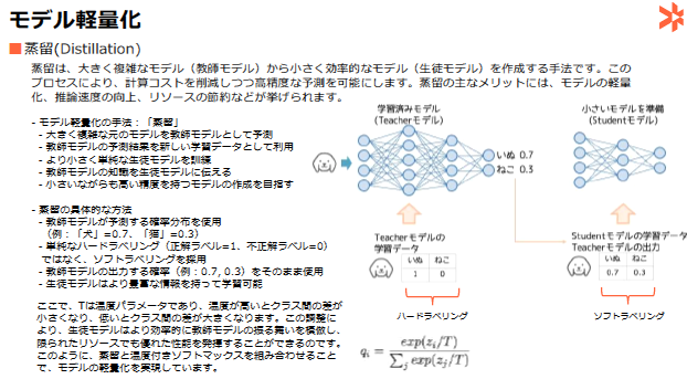 - 情報圧縮の要 蒸留によるソフト・ラベリングでは,たとえば教師モデルが「犬:0.7,猫:0.3」という出力を生成した場合,その確率情報がそのまま生徒モデルの訓練に使われます.ハード・ラベリング(「犬:1,猫:0」)に比べて,ソフト・ラベリングでは多様な情報を含むため,モデルの学習が柔軟になり,少ないデータ量でも高い精度を実現できるのです.