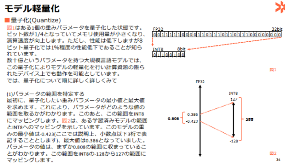 量子化とは,パラメータのビット深度を削減し,メモリ消費を抑える技術です.従来のFP32(32ビット浮動小数点)で表現されていた重みパラメータを例えば,INT8(8ビット整数)に変換することで,メモリ使用量は1/4となり,演算速度が向上します.