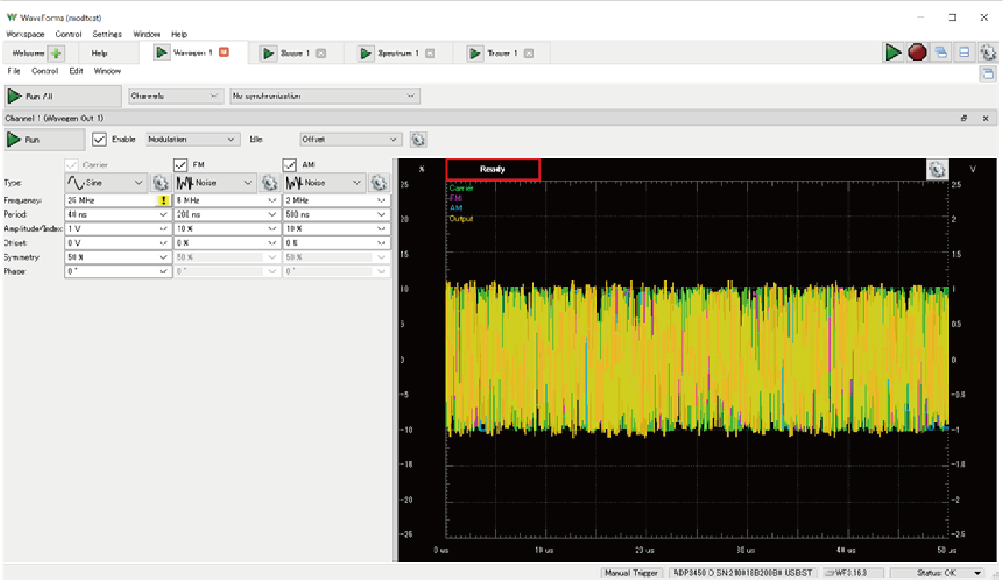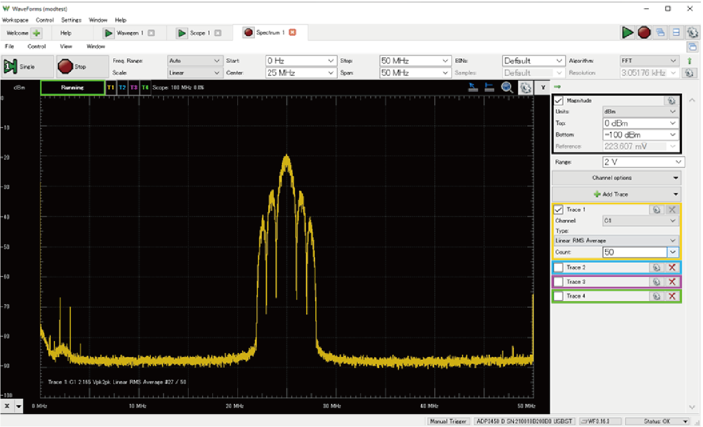 Analog Discovery Proの特徴である広帯域特性を生かした測定をしてみます.正弦波や矩形波を観測は,従来品のAnalog Discovery 2で十分できます.ここではディジタル変調の広帯域信号を観測してみます.