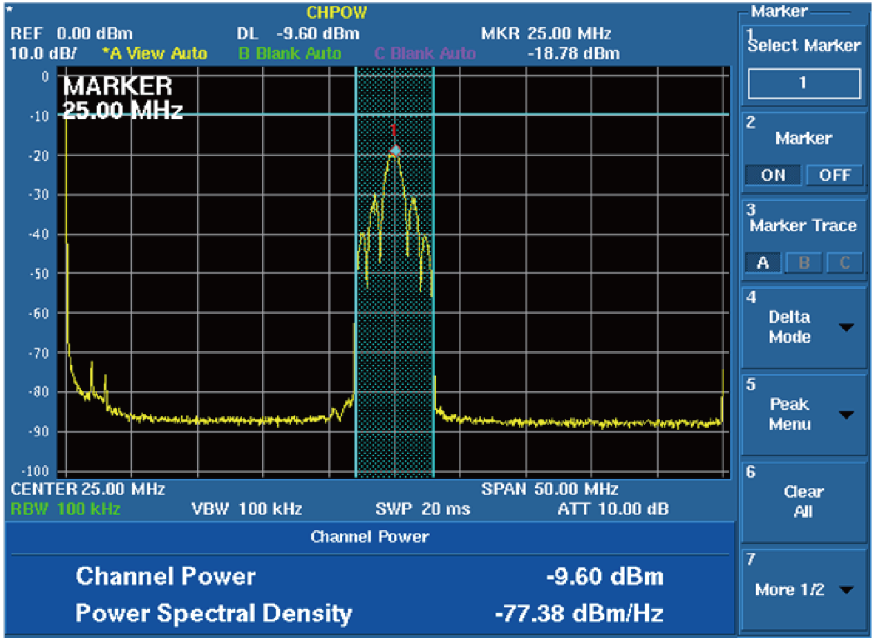 中心25.000MHz,帯域6MHzの変調信号を観測する