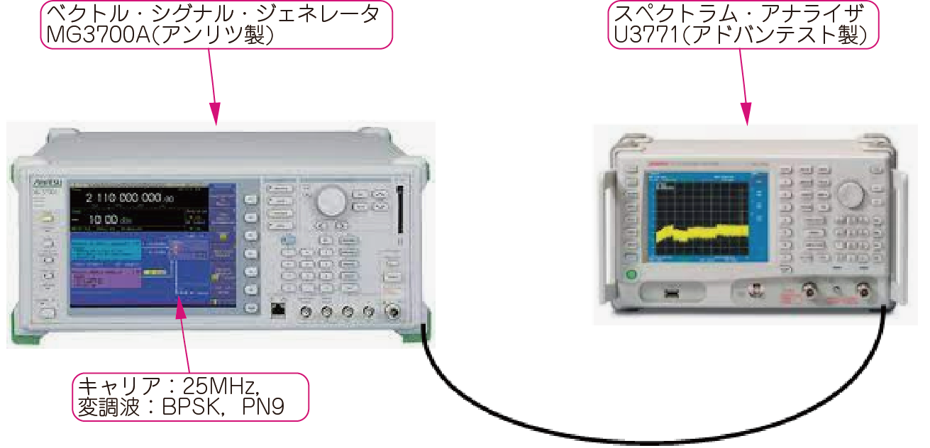 図13に示すのは,実験室にあるデスクトップ型のスペクトラム・アナライザ(U3771,アドバンテスト製)を使って,同じテスト用変調信号を観測した結果です.図14に実験時の接続を示します.