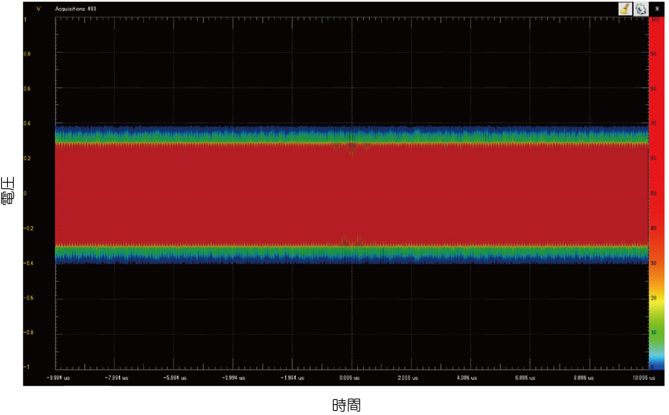 図15(b)と動画5(b)に示すのは,同じくテスト用変調信号の発生頻度を観測した結果です.横軸は時間,縦軸は電圧,色は発生頻度[%]です.長周期変動やまれに起きる波形を捕らえることができます.