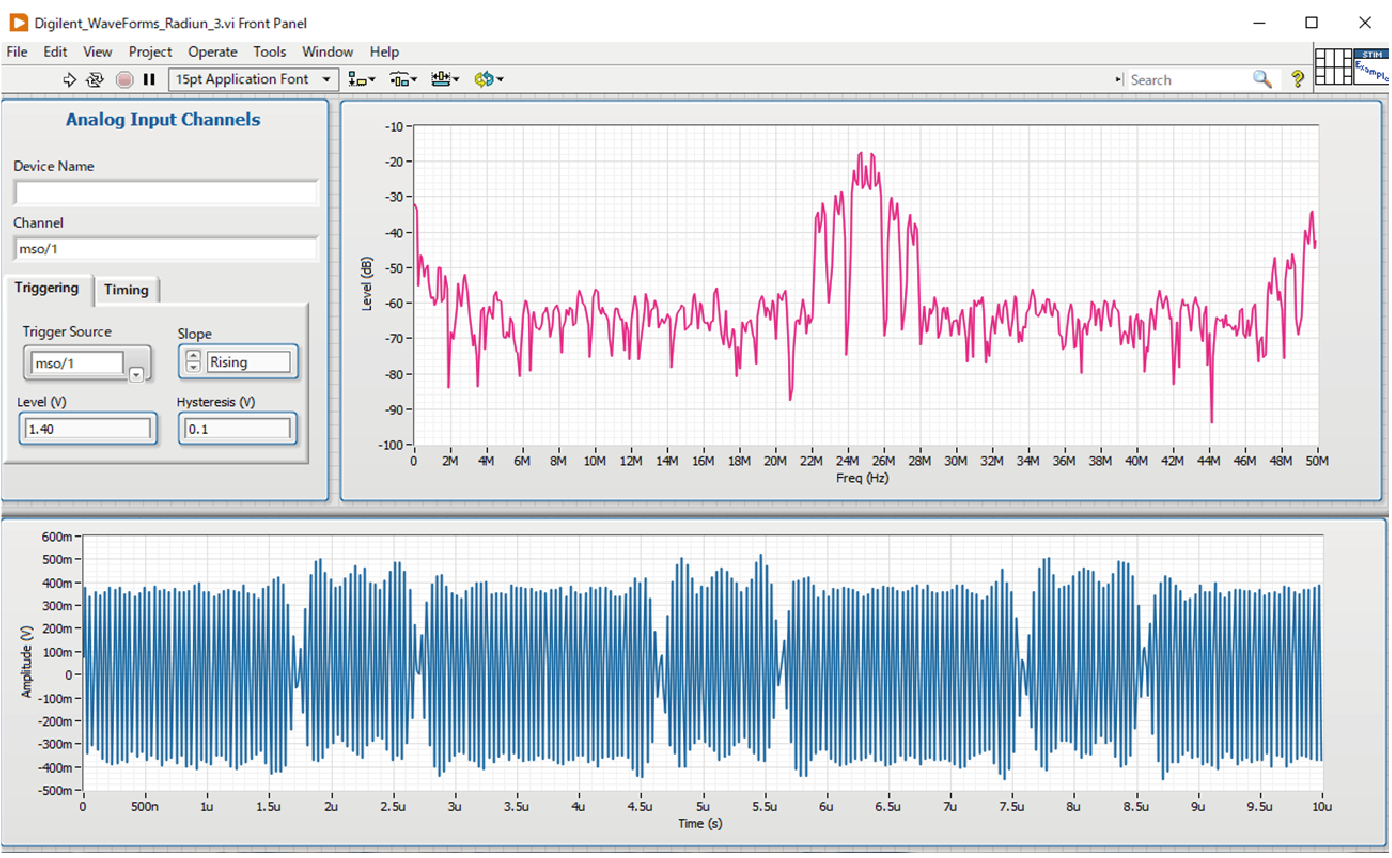 図17に,LabVIEWを使って作ったBPSK送受信プログラムの操作パネルを示します.Analog Discovery Proから出力した信号を自分自身の入力に戻しています.
