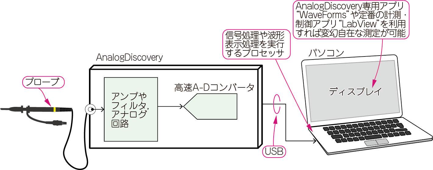 Analog Discoveryは,(1)のアナログ・フロントエンド部分だけを備えており,(2)は普段利用しているパソコンで代用する測定器です.その内部は,アナログ信号とディジタル信号を変換する高速のA-Dコンバータ,高速D-Aコンバータ,アンプ,フィルタで構成されており,USBを介して,ディジタル化した信号をPCに送信したり,PCから受信したディジタル信号をアナログ信号に変換したりします.メインの信号処理はすべて自前のパソコンとフレキシブルなアプリケーション・ソフトウェア“WaveForms”や“LabVIEW”で行います.
