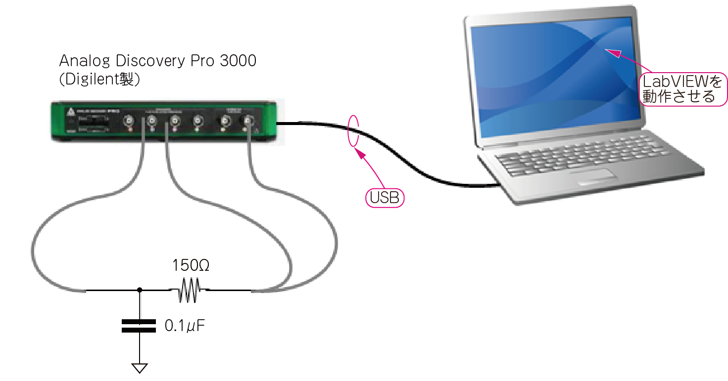 図22に示す接続で,Analog Discovery ProとLabVIEWを使って,1次の$RC$フィルタの安定性を調べてみました.
