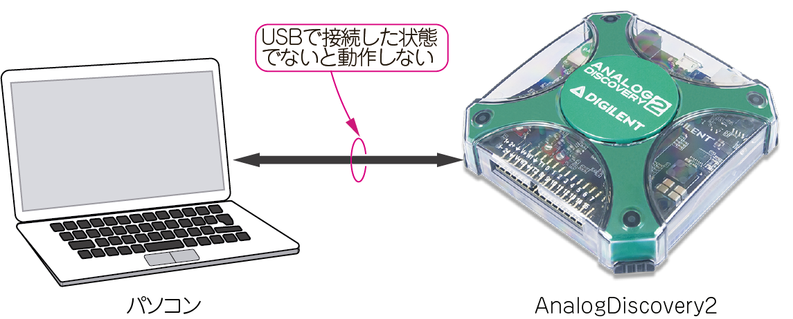 | 図1 Analog Discoveryシリーズは,ディジタル信号処理型測定器に必要な処理のうち,「ディジタル信号処理」をパソコンに委ね,「アナログ信号処理」だけを実行するとてもコスト・パフォーマンスの高いフレキシブルなオールマイティUSB測定器 | |