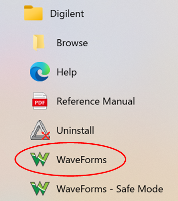 “WaveForms”の完成度はとても高く秀逸で,図5に示すようなスペクトラムの3次元(時間,周波数,レベル)表示も可能です.https://digilent.com/shop/software/digilent-waveforms/から入手できます.WaveFormsは,インストール後は,図6に示すメニューから起動できます.