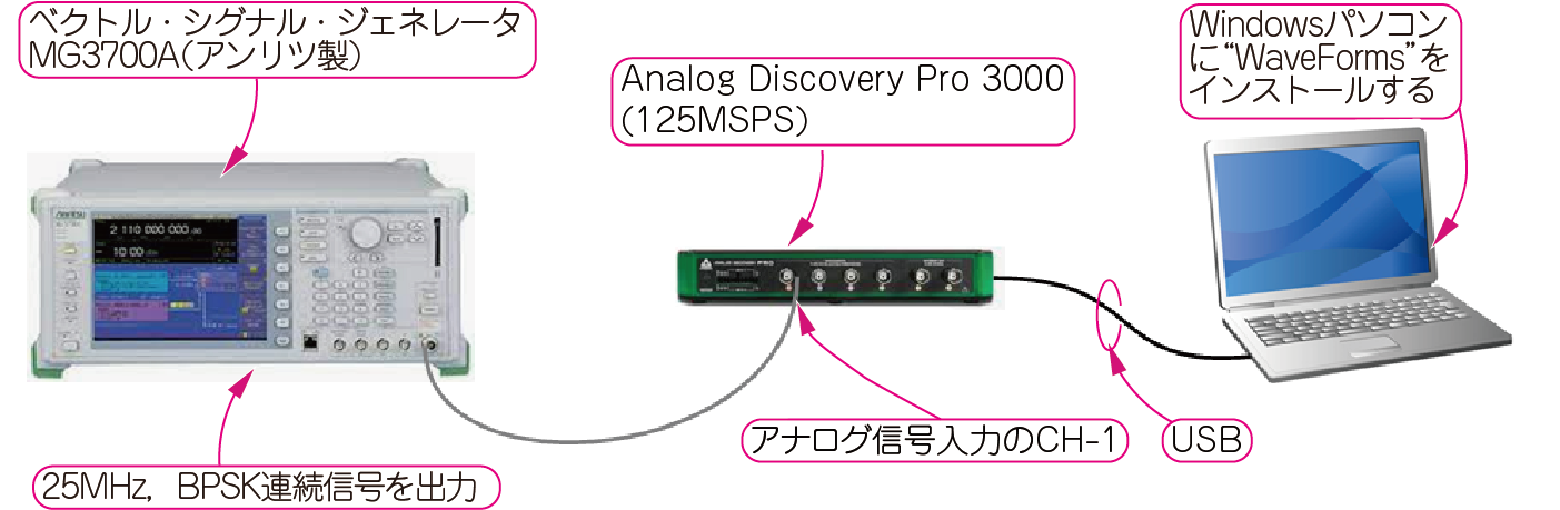 実験室にあるデスクトップ型のベクトル・シグナル・ジェネレータを使って,GPS(Global Positioning System)衛星が出すBPSK変調信号を発生させ,Analog Discovery Proに入力して波形やスペクトラムを観測します(図7).