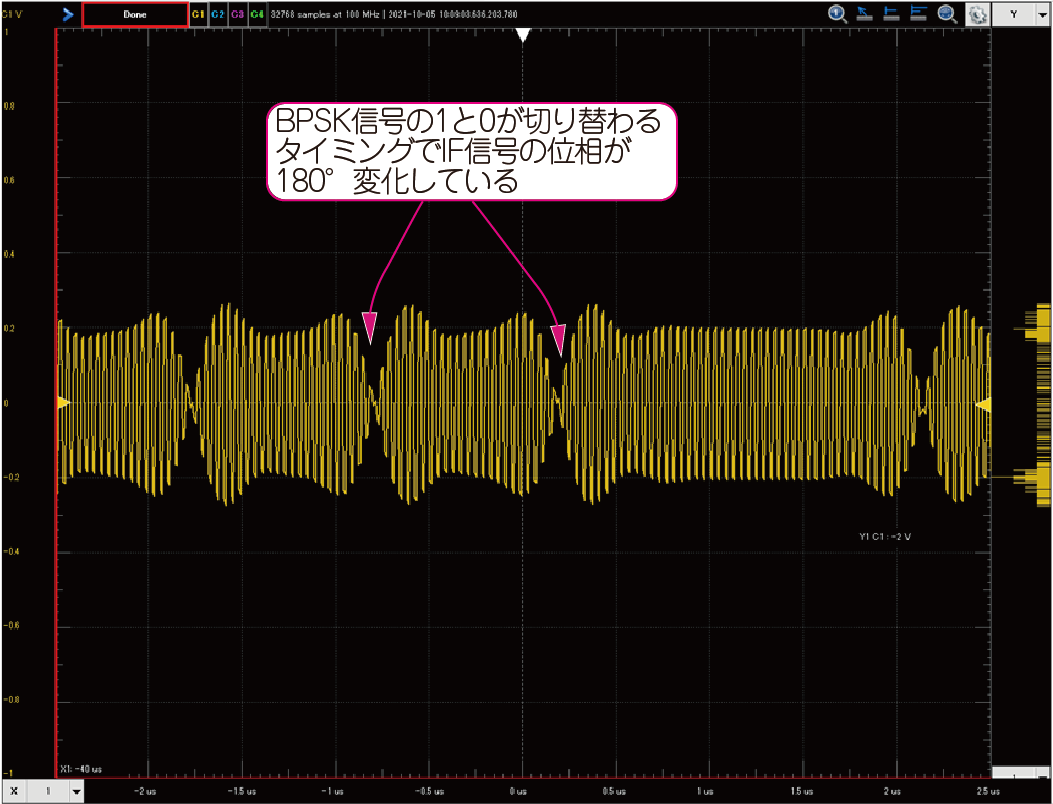 位相が180°反転しているタイミングで,GPSのBPSK変調信号の1と0が入れ替わっています.包絡線のリンギングはベースバンド帯域制限による応答です.