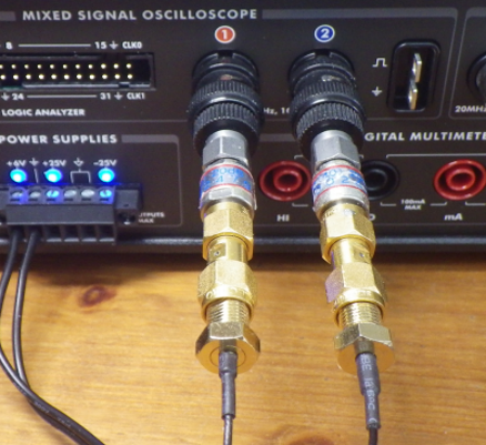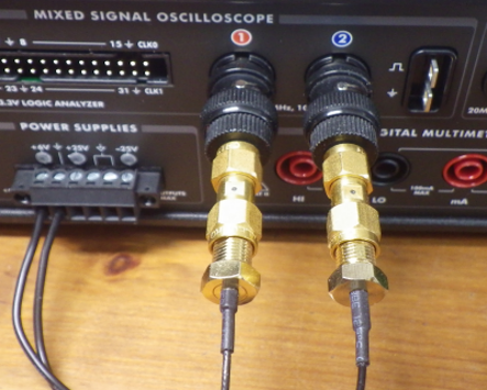 写真11に示すのは,BNC-SMA変換コネクタで,同軸ケーブルをCH-1とCH-2に接続したところです.20dBアッテネータは取り外してあります.