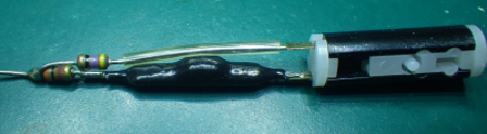 写真15(b)に示すのは,プローブの先端部(チップ部)を分解したところです.減衰率設定を“×1”にしたときの信号経路には,シリーズに47Ωが挿入されます.減衰率設定を“×10”にしたときの信号の経路には.300Ωと9MΩ(黒い樹脂封止)が挿入されます.右端の円筒は,×1と×10の切り替え用スライド・スイッチです.黒い樹脂の中には,9MΩと位相補償コンデンサが並列に入っていると思われます.