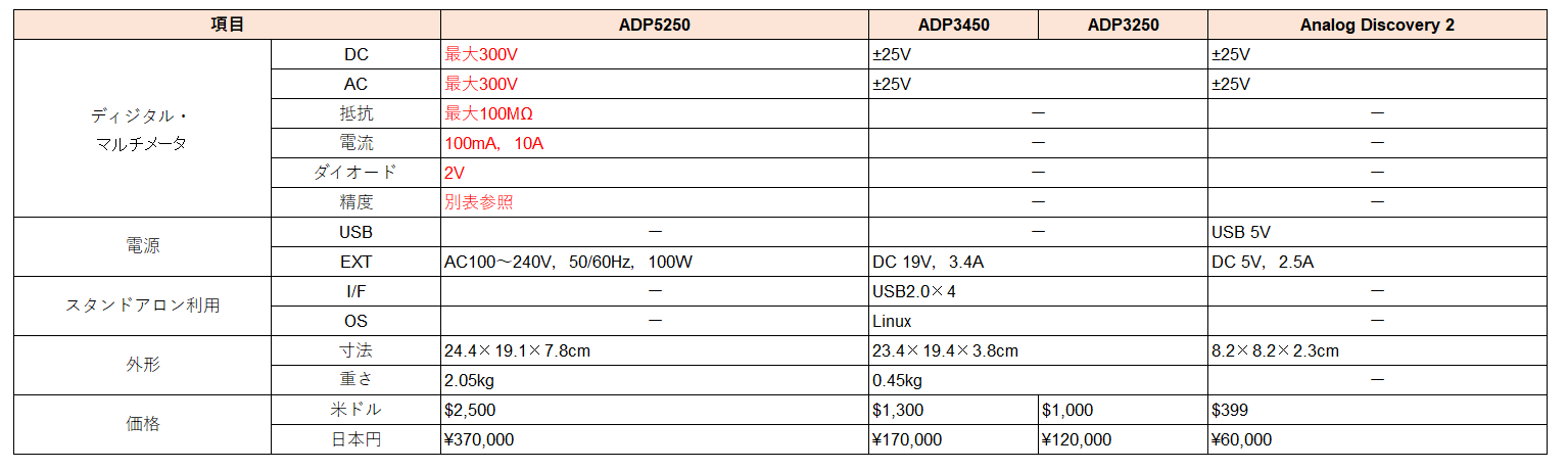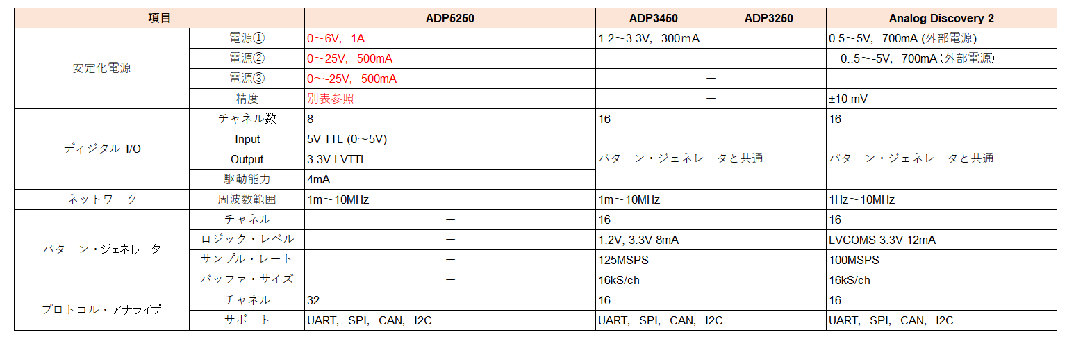 表1に,Analog Discoveryシリーズの性能比較を示します$^{(1)(2)(3)}$.AD5250特有の注目ポイントを赤字で示しました.
