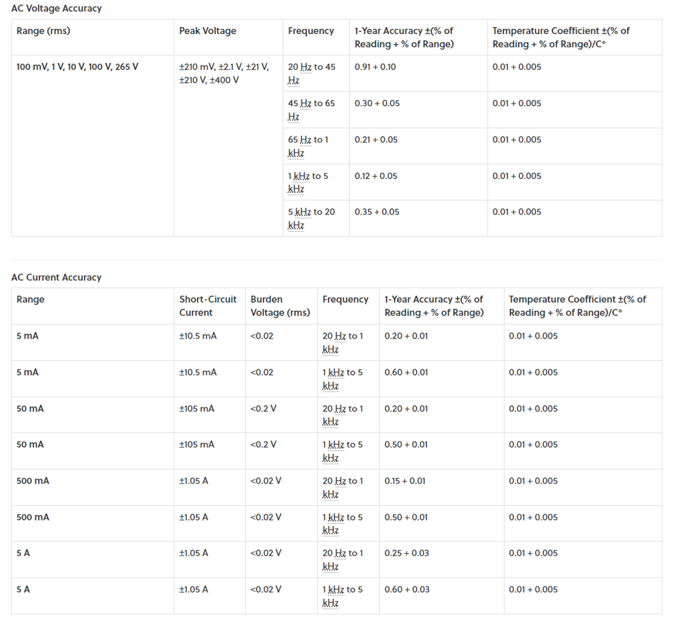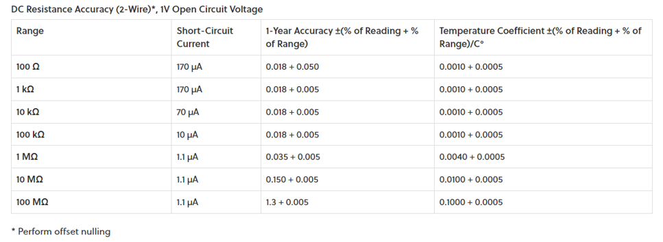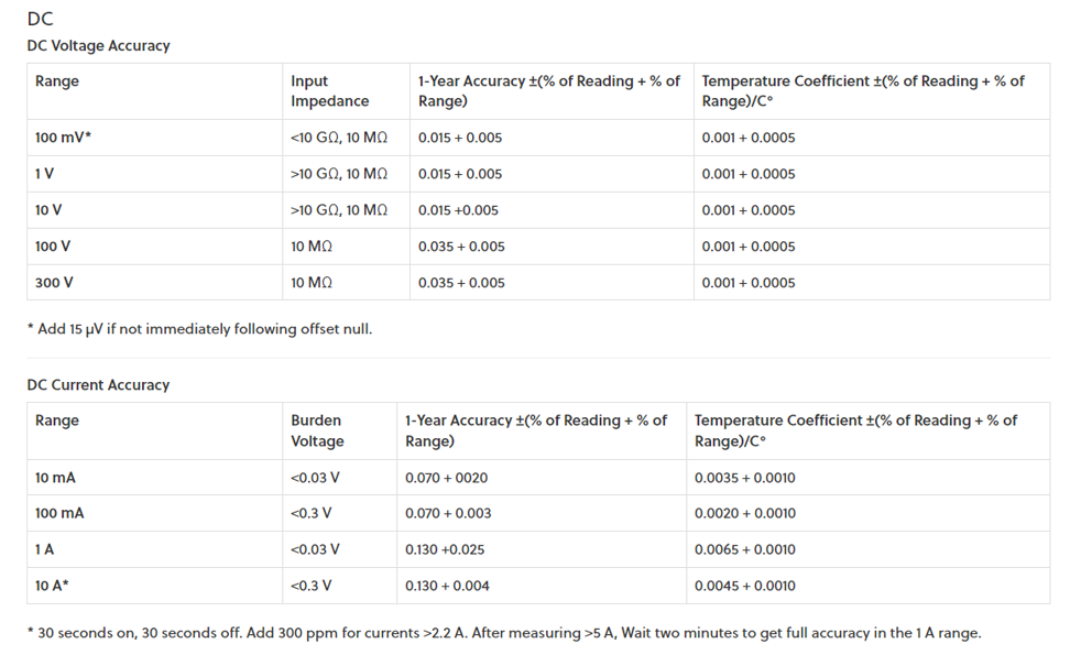表3に示すのは,DC電圧と電流の精度です.1年間の精度保証が謳われています.表4に示すのは,抵抗レンジの精度です.