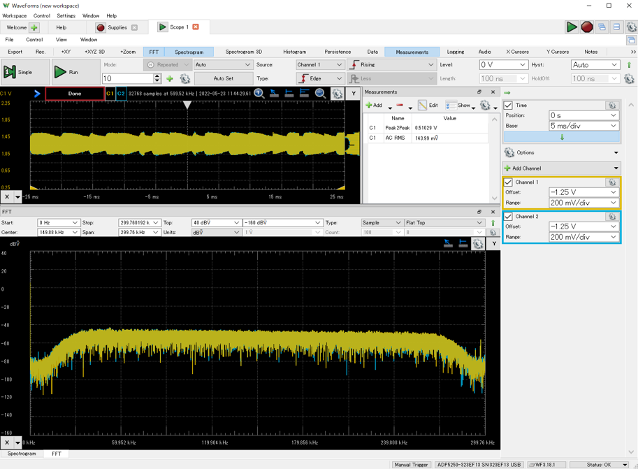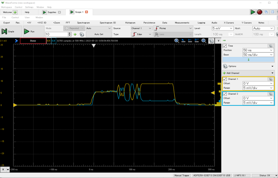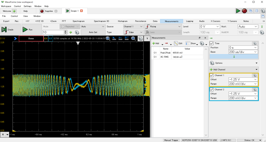ADP5250の1GSPSというサンプリング速度を試すため,少し厳しめの信号を見てみます.またCH-1とCH-2の位相差(遅延差)も確認します.
