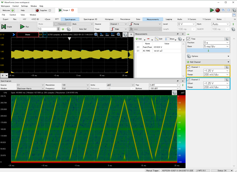 | 図13 RF受信信号のレベルが-125dBmのときのチャープ信号の波形(上)とウオーターフォール(下) | |