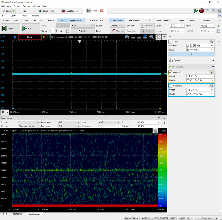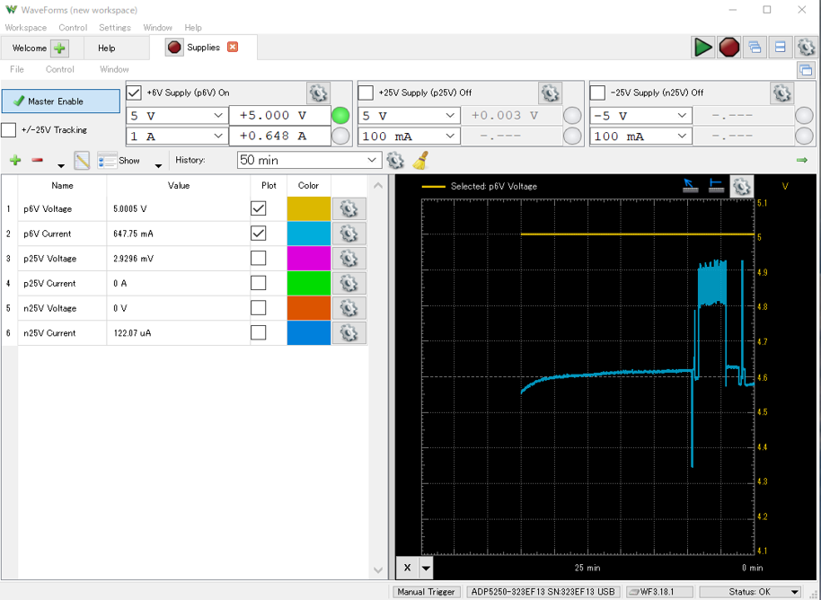 ウォームアップ時の電流変化を観測するために,横軸のスパンを遅め(50分)に設定しています.現在の電圧表示はアクティブなので,横軸のラベルは“V”です.ADP5250が信号処理を始めると,消費電流が増すようすが観測できています.