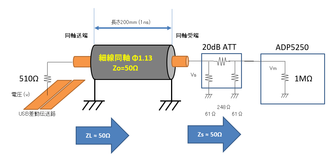 図14に示すように,伝送路の途中に「20dBアッテネータ」を入れると,同軸ケーブルから見たADP5250のCH-1とCH-2の入力インピーダンス(1MΩ)が50Ωになります.受端が50Ωで,伝送路の特性インピーダンス $Z_0=50$Ωなら,送端側に何を接続しても多重反射はほぼゼロになります.