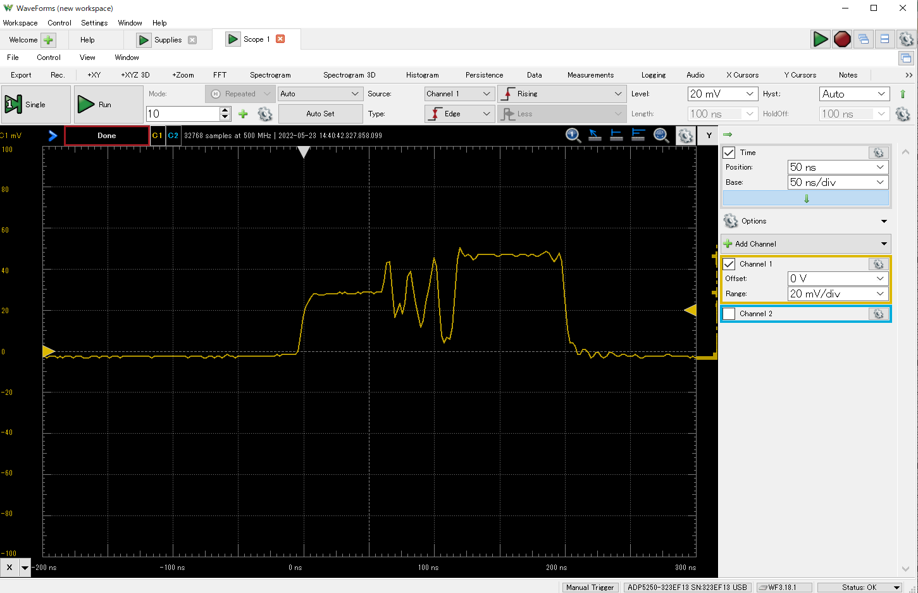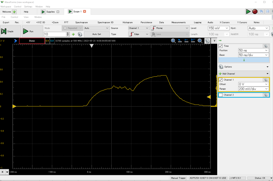 USB2.0の通信速度 480MSPSは,ADP5250の最大サンプリング・レート 1GSPSに対してぎりぎです.高速時の波形を見ると,ADP5250のアナログ帯域を超えているため減衰しています.