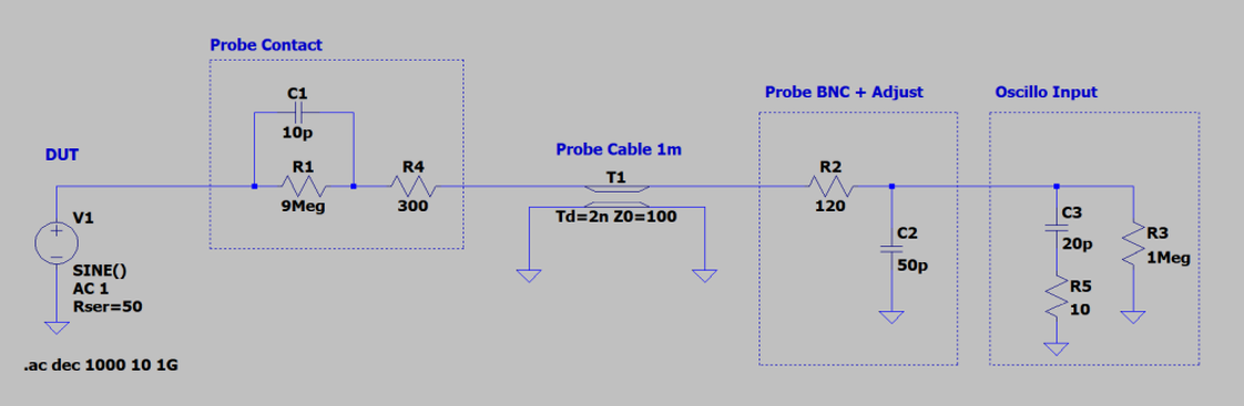 図20に示すのは,パッシブ・プローブの減衰率を×1に設定したときの回路です.この回路の周波数特性をLTspiceのAC解析モードで調べます.