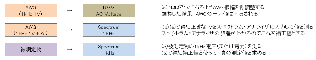 ディジタル・マルチメータと任意波形発生器AWGで得たAC 1kHzの正確な1V基準をスペクトラム・アナライザに移します.値を移していく過程で,各測定器の分解能や経時変化などの影響で誤差が蓄積されるため,経路はシンプルにします.このように,測定系に絶対的な基準値をもたせる場合,DCや低周波の場合はディジタル・マルチメータが使用されます.